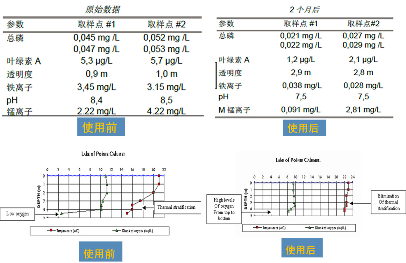 卡爾利梅湖位于加拿大魁北克省,水體面積22公頃,最大水深4.5米,平均水深3米。水體富營養(yǎng)化嚴重,藍藻爆發(fā),水體透明度低,歐亞水蓍草大量繁殖(每年需收割3-5次),鐵錳離子超標,硫化氫超標,水生植物種群數量少。
