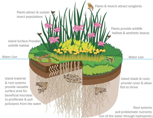 浮動(dòng)濕地也叫浮式濕地,是通過在水體中搭建類似人工濕地的結(jié)構(gòu),對(duì)水體污染物去除并實(shí)現(xiàn)生態(tài)修復(fù)作用。與傳統(tǒng)人工濕地相比,浮動(dòng)濕地能夠直接作用于布設(shè)的水體,滿足水位變化要求,適應(yīng)不同水深,無需占用土地資源,構(gòu)建快捷,其單位面積處理效率高于一般人工濕地。浮動(dòng)濕地應(yīng)用于污染水體水質(zhì)改善與生態(tài)修復(fù)。