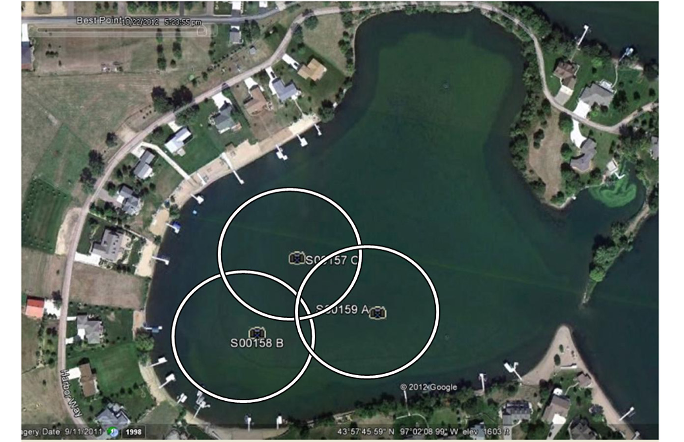 位于美國(guó)南達(dá)科他州Harbor Bay的Madison湖長(zhǎng)期接收周?chē)r(nóng)業(yè)面源污染、地表徑流和市政污水的污染物入湖,湖底堆積的底泥常年向水中釋放污染物,導(dǎo)致湖體水質(zhì)富營(yíng)養(yǎng)化嚴(yán)重 。2012年6月初由于干旱湖水水面下降,藍(lán)藻大規(guī)模爆發(fā)。根據(jù)該項(xiàng)目現(xiàn)場(chǎng)踏勘及底泥調(diào)查結(jié)果,設(shè)計(jì)將三臺(tái)奧科?太陽(yáng)能循環(huán)復(fù)氧設(shè)備以三角形點(diǎn)位布設(shè)。